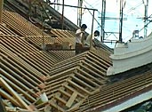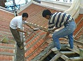 Once all the beams and battens had been replaced, reconstruction started on the valley area between the main temple building and the prayer hall. The previous builders had introduced a turtle hump formation - an ingenious way to ensure good drainage at the valley area.